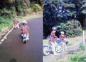 十分休憩できたので、そこから、一山越えて、スダジイの木がある地区へ移動することに。まぁ一山といっても高さは数十メートルです。でも大人でもママチャリなら大変な峠ではあるのです。途中には島根県のクレー射撃場があります。そこを登って、スダジイまで行く事にしました。当然登りは、自転車を押して歩きましたが、下りは颯爽と自転車です。下りきってから右折してちょっと走ればスダジイの木のパーキング、そこで休憩とスダジイの木を見物することにしました。画像右はスダジイの木をバックにこどもたちです。小さな自転車で、ヘルメット(僕のです)をかぶりサイクリスト気分なふたりですね。